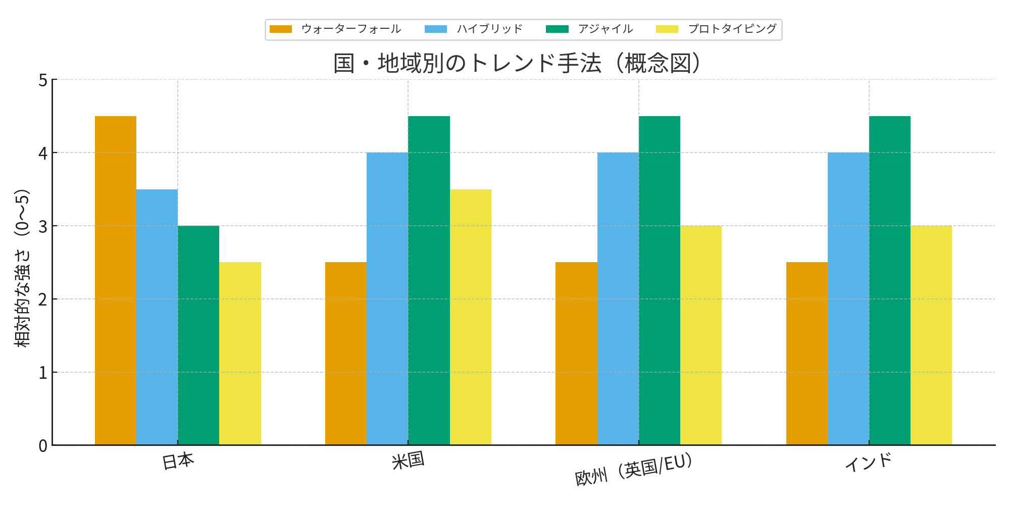 •国・地域別トレンド手法(概念図。相対スコア0–5。根拠は各政府ガイド/IPA 2024/SI各社公開資料)。