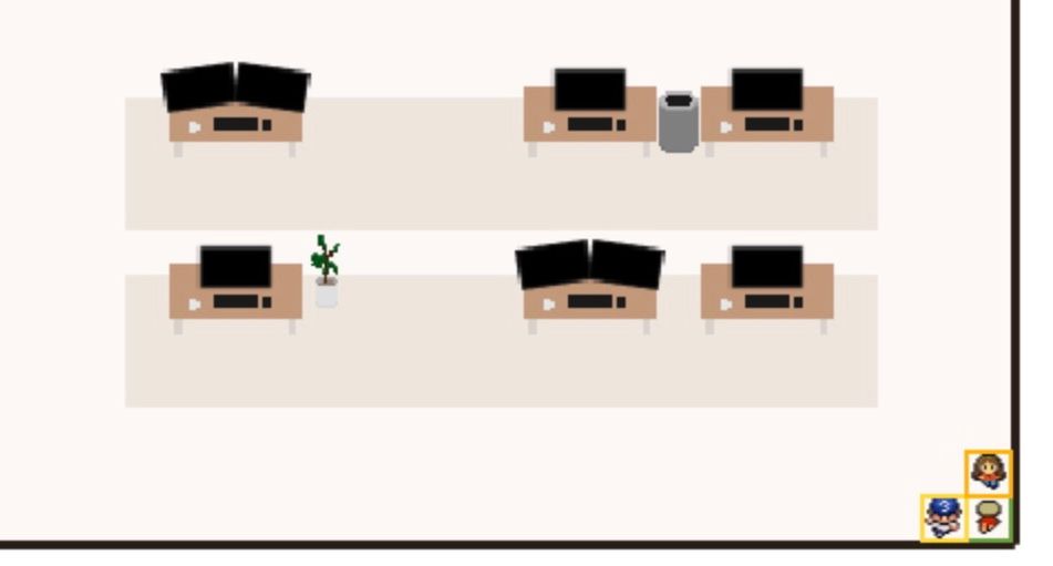 一味変わった見た目でまるでゲーム画面ですね。マップ上にはPCとデスクもありバーチャルオフィス感があります。画像の右下にキャラクターがいますが、これがログインしている人になります。キャラは矢印キーで上下左右に動かすことができます。そして "近くにいるキャラの人とそのまま会話ができる" のが最大の特徴となります。また遠くに行けば行くほど相手と自分の声が遠くなり、約8マスの距離をとると完全に声が聞こえなくなる、といった仕様です。このように肩トントンも不要で近くに移動して話しかけるだけです。こんな見た目ですがまるでリアルな世界ですね!