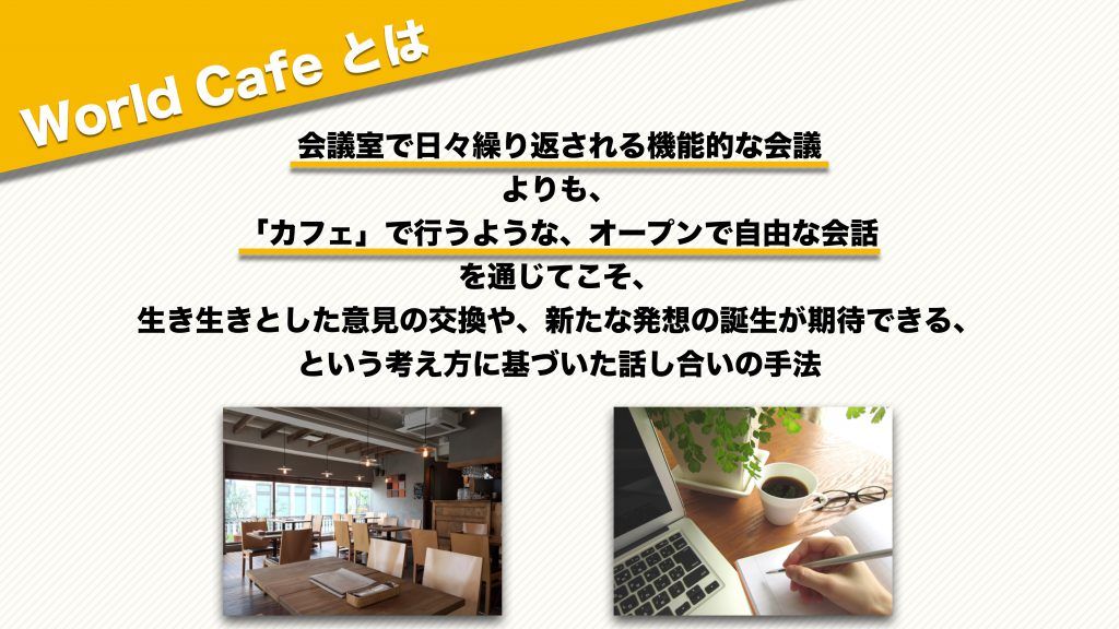 「そもそもワールドカフェって何?」 「どんなメリットがあるの?」 そんなワールドカフェの考え方については、以下のサイトを読んで学びました。
