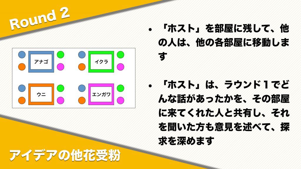 - ラウンド2: ラウンド1のテーブルに1名を残して残りのメンバーは他のテーブルとメンバー入れ替えて話し合い
