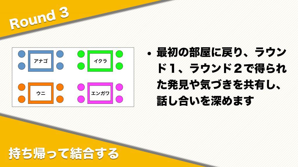 - ラウンド3: ラウンド1のテーブルに戻って話し合い