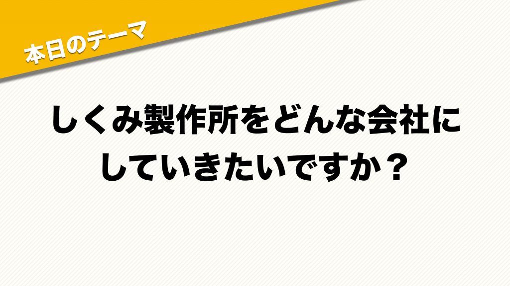 メンバーが揃ったら、各グループがどんな感じの話し合いをしたか発表してもらいます。 今回のお題は「しくみ製作所をどんな会社にしたいですか?」というテーマで話し合いをしました。