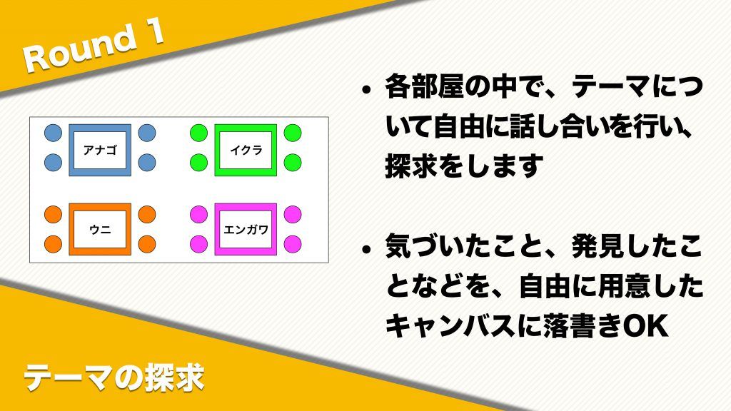 冒頭の進め方にも書いた通り、ラウンドは全部で3つあります。 ラウンド1は、ランダムに構成された4人のメンバーでテーマについて話し合いを進めていきます。