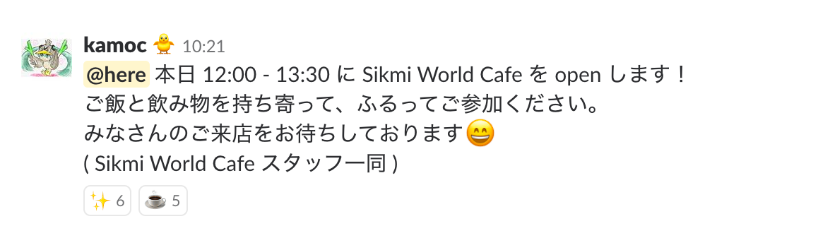 しくみ製作所では社内でのコミュニケーションを主に Slack で行っています。 Slack でワールドカフェ開催のお知らせを告知しました。 運営スタッフは会議のファシリテーターではなく、自宅に招く特別なゲストのように参加者をお迎えします。