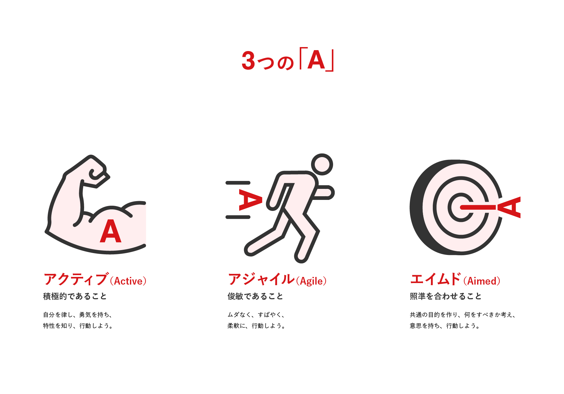 また、行動指針として「3A」を掲げていて、しくみ製作所の社員として、楽しく成長するために必要な基盤であると考えています。