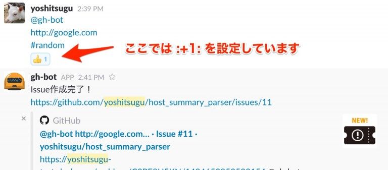 - Slack上で発言にEmoji reactionをつけるとそのままGitHub Issueとして登録される