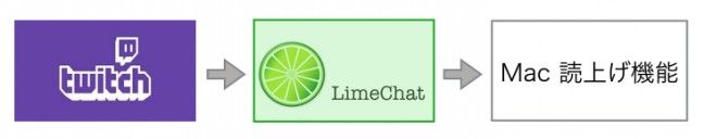 この Ruby スクリプトでは、以下の図のように Twitch から LimeChat を使ってコメントを取得し、LimeChat のログを Mac の読み上げ機能で読み上げさせています。