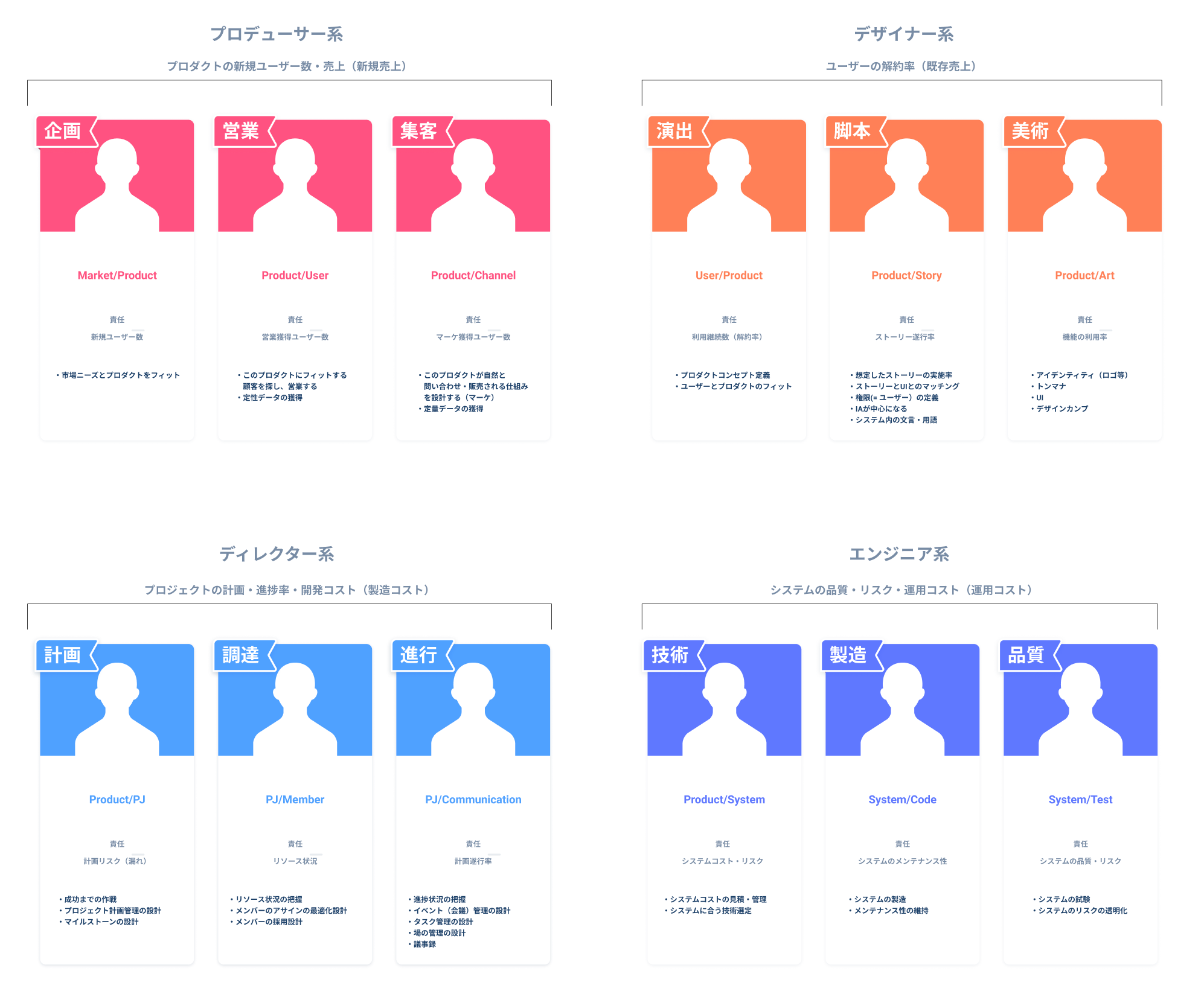 特に、デザイナー系に属している部分の解釈にずっと悩んでおり、一般的にはUXデザイナーと呼ばれる部分に近いと思っています。色々な現場経験を経て、映画や演劇などとのアナロジーから、演出や脚本などの表現を当ててています。特に自分が数年取り組んできたのがここで、ようやく解釈整理ができたなと感じています。