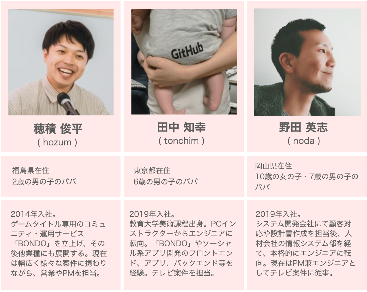 今回は「育児パパ座談会」と題し、hozumさん、tonchimさん、nodaさんにお集まりいただき、日頃の育児について語っていただきました。育児で大変なことや仕事との両立で気をつけていること、フルリモートで働くしくみの環境はどうか等を聞かせてもらいました。