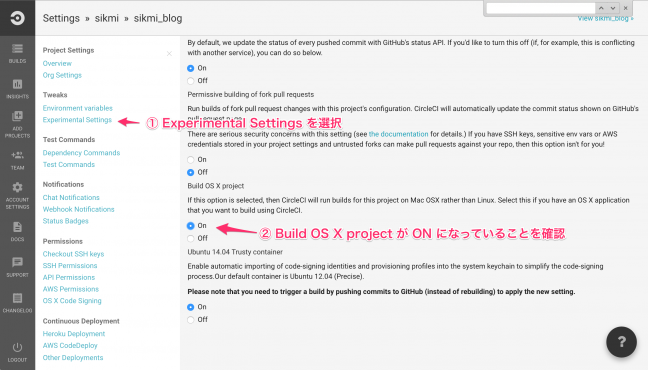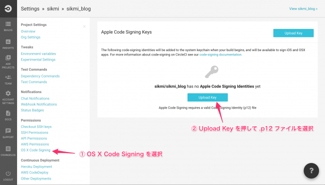 CircleCI の Project Setting ページを開き、 Permissions > OS X Code Signing を選択して、.p12 ファイルをアップロードします。 この時、.p12ファイルのファイル名に全角文字が含まれるとエラーになるので注意して下さい。