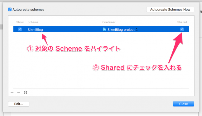 - 対象のスキームの“Shared”にチェックを入れる(画像参照)