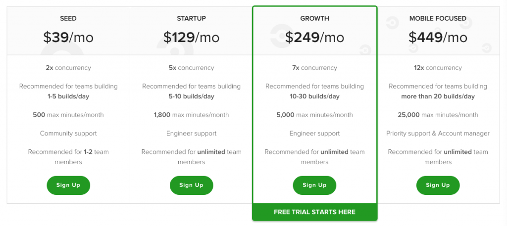 記事執筆時点(2016/03/16)では CircleCI でiOSアプリをビルドするためには、有料プランの加入が必須となります。 SEED, STARTUP, GROWTH, MOBILE FOCUSED の4つのプランがあり、GROWTHは2週間無料で試すことができます。
