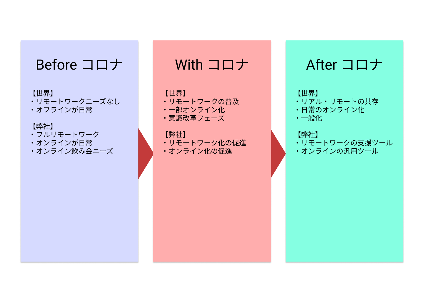 さて、そんなこんなで3年前から何度かreBakoに近いツールについての企画が出ては消え、というのを繰り返してきましたが、with コロナ時代の到来により状況が一変します。何度も話が脱線して申し訳ないのですが、弊社のMissionは『少し未来の日常をつくる』というものです。この、「少し未来の日常」がコロナで急加速してやってきてしまったんですよね。実際、このMissionは2〜3年前ぐらいから掲げていますが、最近「New Normal」という言葉が世間を賑わせています。これ、まさに「少し未来の日常」じゃないですか。この言葉を聞いたときはちょっと笑ってしまいました。と同時に、我々のMission達成より先に「New Normal」がやってきてしまう、という事態にもなり焦らされてもいます。