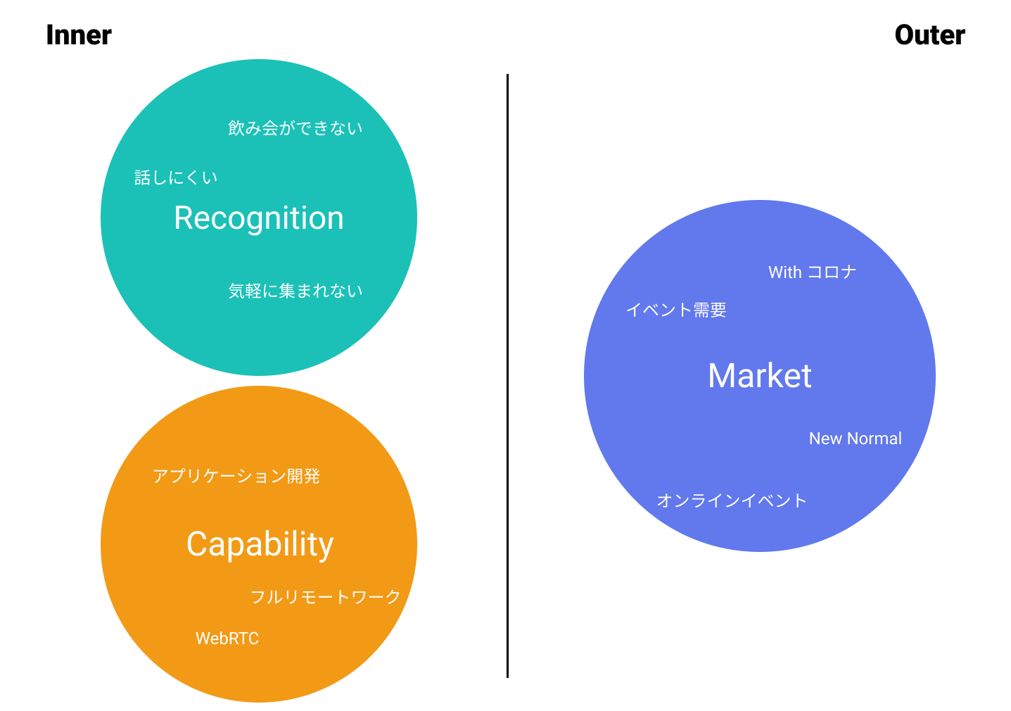 そこで距離感の問題を解消できるツールを開発したらどうか?というアイディア自体は出てきていたんです。もちろん当時もこれを解決するツールを作ろう!という機運はあったんですが、これを作ったとして誰が使うんだろう?というマーケットの問題がありました。また、技術的にも通信周りについて研究できていたわけでもなかったため、実現方法もそれほど具体的にイメージできていませんでした。つまり、ぼんやりとした課題感、Capabilityの不足、Marketの需要、全てが揃ってなかったんですね。ほぼ断言しても良いと思うんですが、当時このプロダクトを作っても、誰も見向きもしてくれなかったんじゃないかな。現在のコロナ過にあって始めて、Marketが生まれたと考えています。