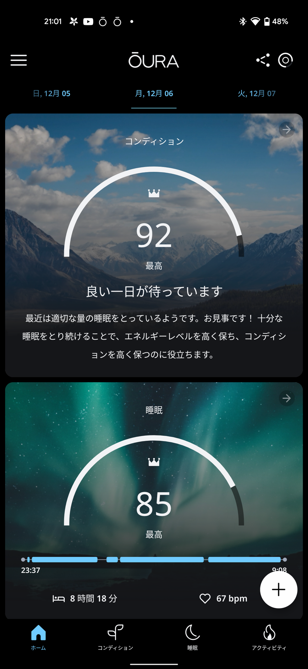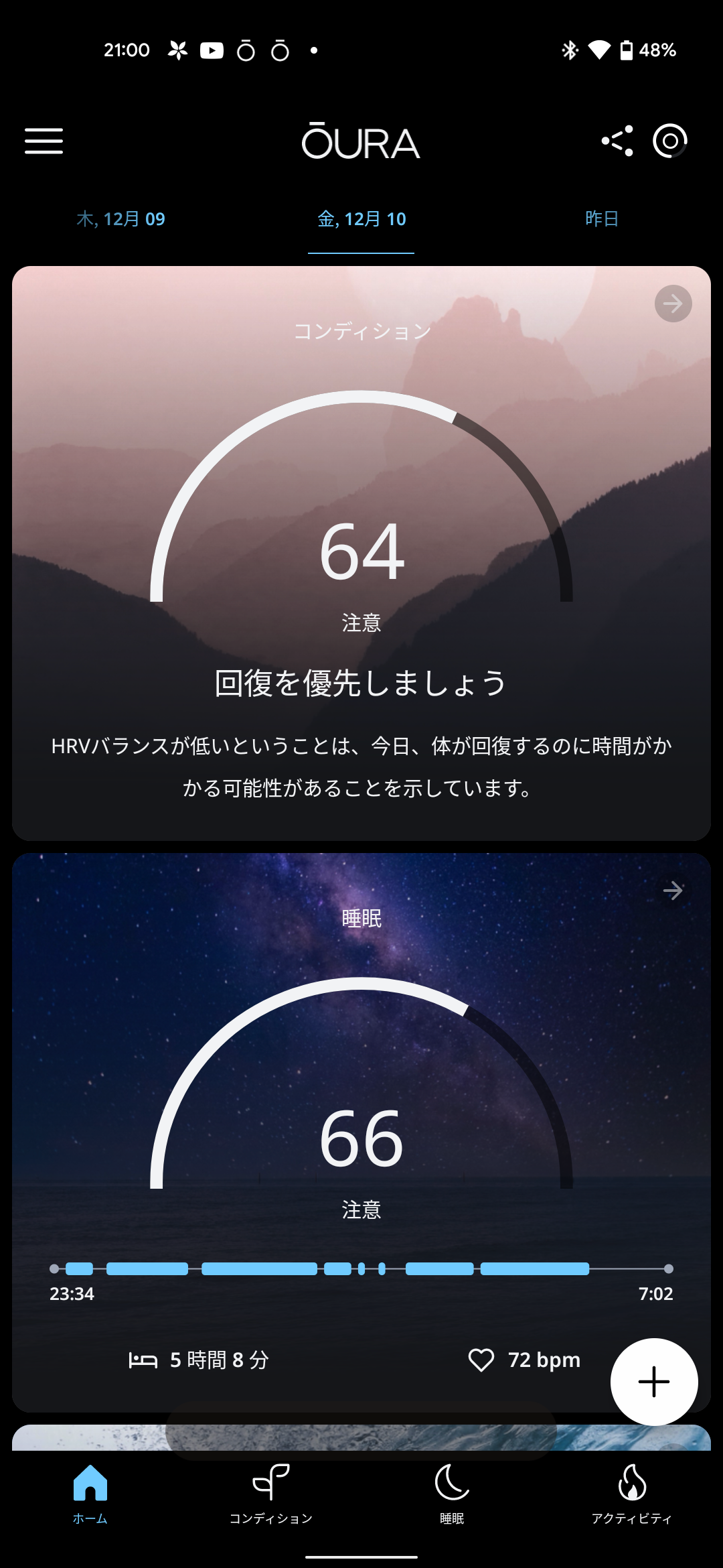風呂、リングの充電以外は常時身につけているので毎朝に計測し、1日の過ごし方を決めます。