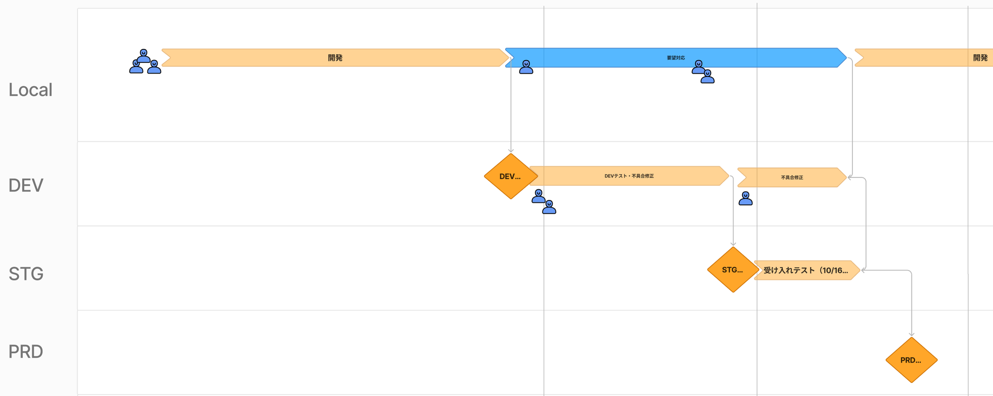 当時の開発の状況を見てみると、開発 → 試験環境へリリース → 検証・不具合修正 + その他細かい対応 → STG環境へリリース → 受け入れ試験 → 本番環境へリリース と開発が直列で行われていました。