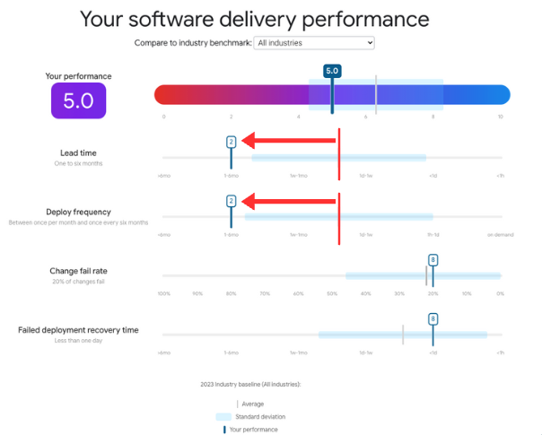 すると、デプロイ頻度とリードタイムに問題があることが判明しました。(図の赤線が平均値。左に行くほどスコアは悪い)