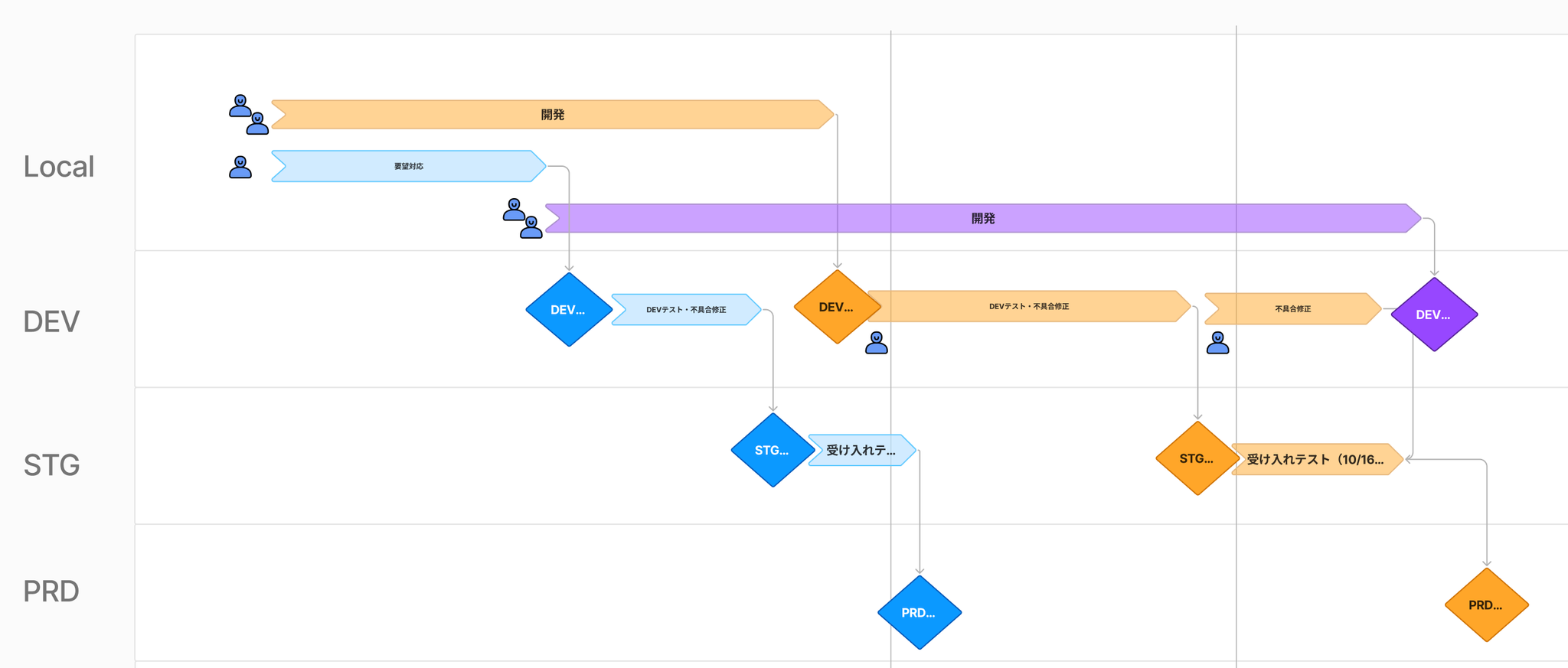 リリースフローなどはシンプルで運用は楽だったのですが、これだとその他の細かい対応がスタックしてしまったり、次の開発が今の開発のPRDリリースまで開始されないなどリリースサイクルが大きくなる要因がありました。