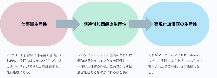 まず、開発生産性とは一般的に何を指すのか?というところから入りました。『エンジニア組織を強くする 開発生産性の教科書』(佐藤将高 著) の中で以下のように開発生産性には三つのレベルがあるという内容を目にしました。