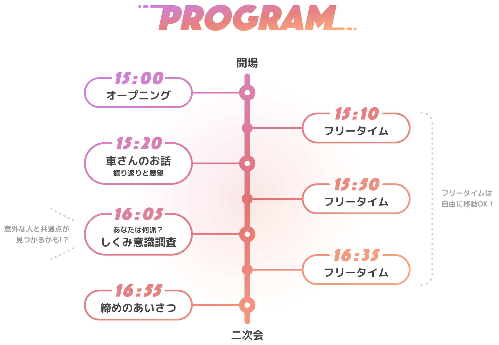 当初のプログラム案では、代表 車さんの話のあとはボードゲームでも…程度の荒いものでした。しかし皆がコミュ強陽キャなわけではありません。共通のネタがないと話せない民もいるのです(補足:控えめな人間同士の場合、ゲームを進めるための業務的なやりとりで会話は終了します)。そこで、たとえ共通の話題が見つからずとも会社のことなら話せるのではないか?!という案が出ました。