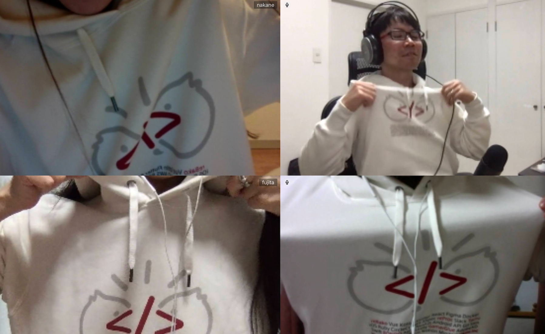 「家族にとられそう」なんていう発言も見られるくらいパーカーの評判は上々で、同じデザインで個人的にTシャツを作った社員もいます。また、後日のMTG時にこのパーカーを着ている方々を発見!普段使いできるところもいいですね。次回も何かお揃いアイテムあるといいなぁ。